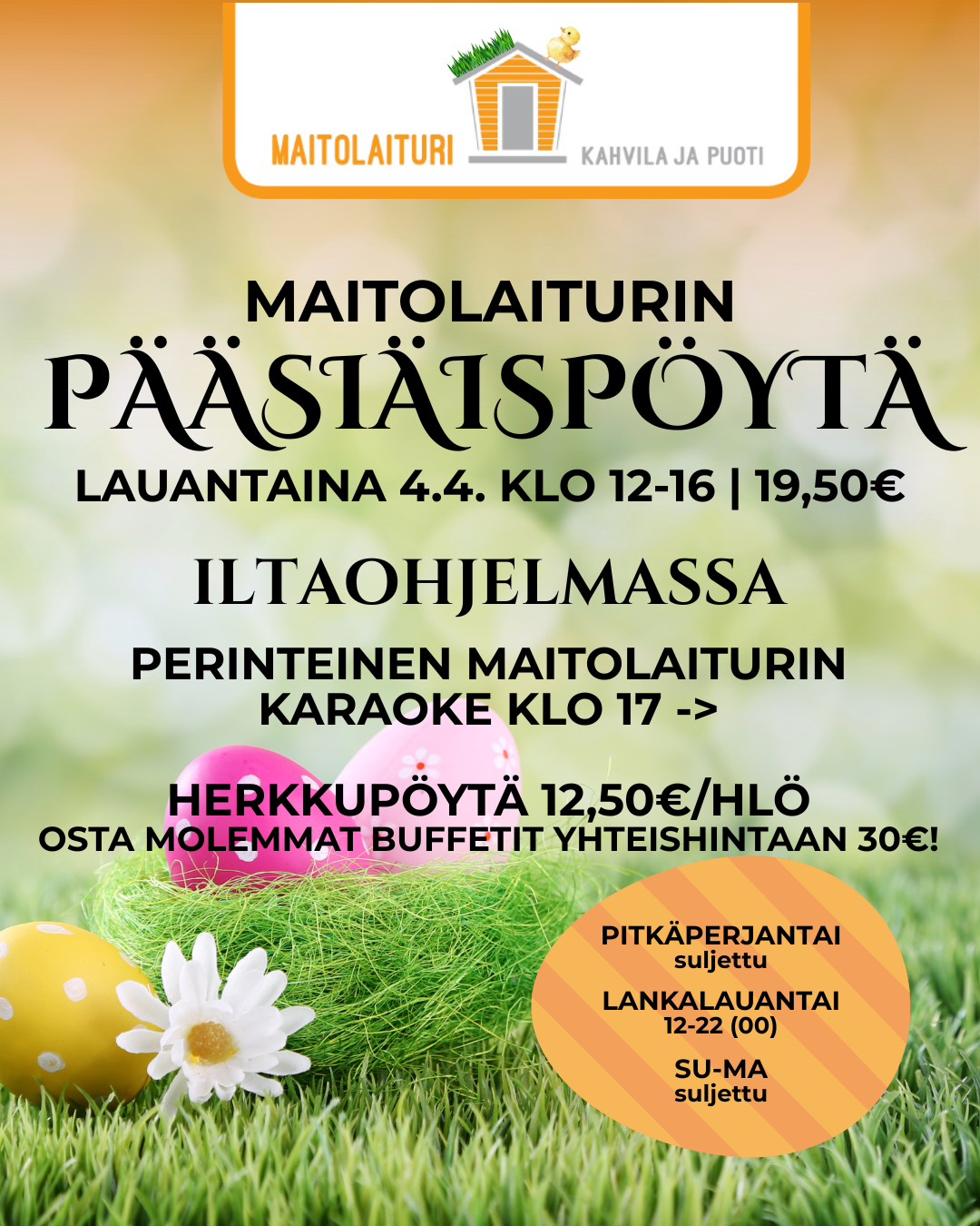 Maitolaiturin pääsiäispöytä on katettuna lauantaina 4.4. klo 12-16. Karaoke alkaa klo 17 ja herkkupöytä on tarjolla iltaan asti!